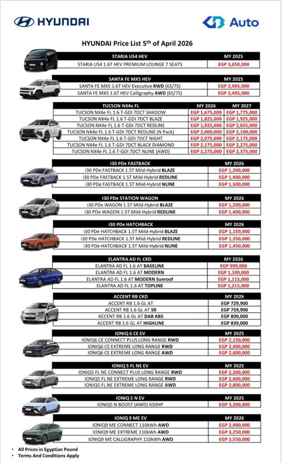 أعلنت مجموعة جي بي أوتو وكيل علامة هيونداي في مصر، قائمة أسعار أسعار سيارات هيونداي 2026 في مصر بعد زيادة مختلف الطرازات بقيمة تباينت بين 100 و150 ألف جنيه، وطرح طراز توسان 2027 مع توافر موديل 2026 أيضًا.
